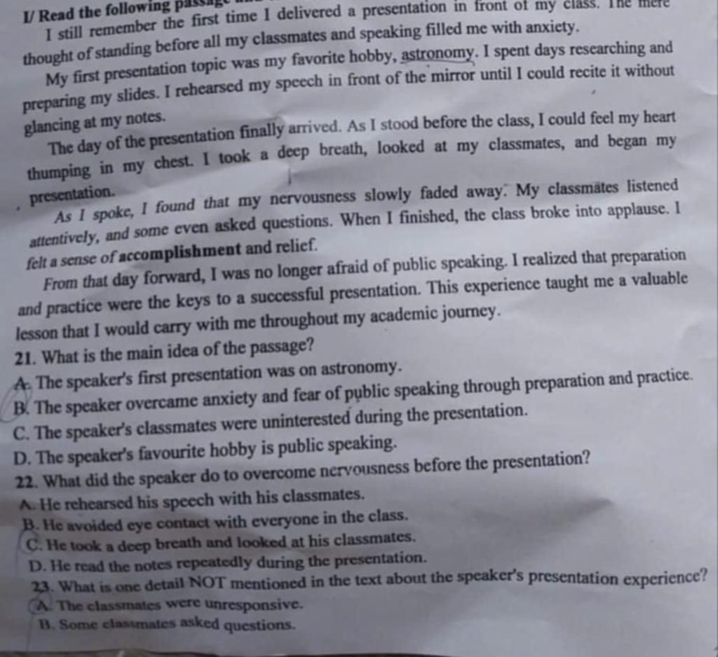`-` "As I spoke, I found that my nervousness slowly faded away." `->` Do được thực hành và tiếp xúc nhiều nên sự lo lắng ban đầu giảm dần