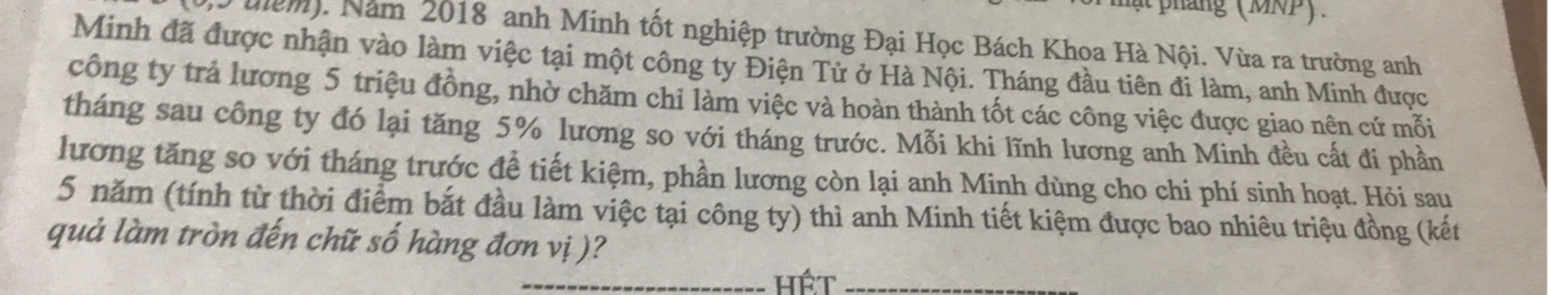 Gọi lương tháng đầu tiên là $A=5$ triệu đồng, phần trăm tăng lương là $r=5\%$
