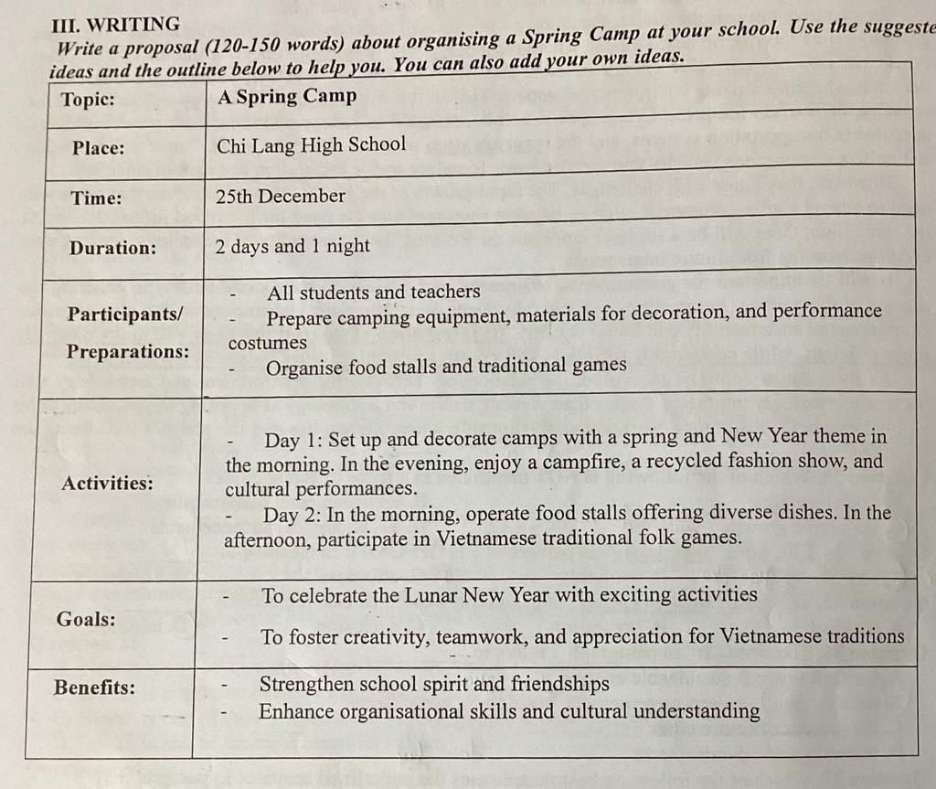 Write a proposal (120-150 words) about organising a Spring Camp at your school. Use the suggeste