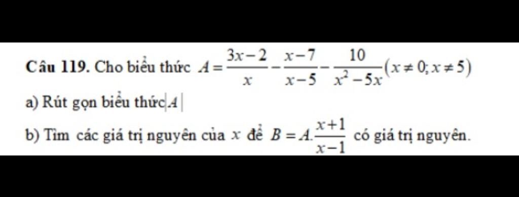 $a)$ Ta có: $A=\dfrac{3x-2}{x}-\dfrac{x-7}{x-5}-\dfrac{10}{x^2-5x}$ ($x\ne0$; $x\ne5$)
