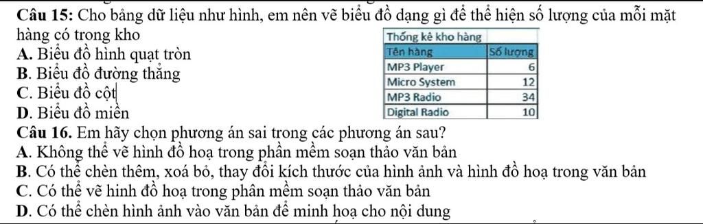 Câu 15: Cho bảng dữ liệu như hình, em nên vẽ biểu đồ dạng gì để thể hiện số lượng của mỗi mặt