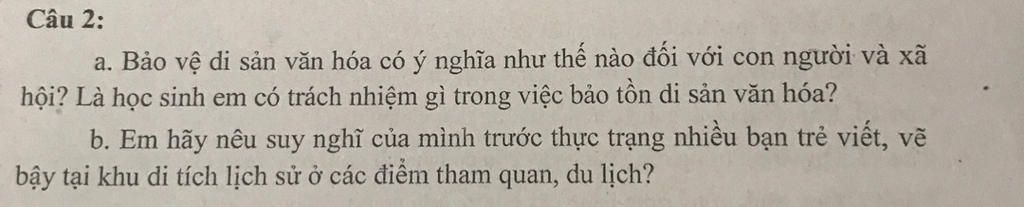 b, Đó là những hàng vi hủy hoại tài sản chung, làm mất đi bản sắc vốn có của khu di tích lịch sử ở các điểm tham quan du lịch. Đồng thời, những hành vi ấy còn thể hiện lối sống tùy tiện, không biết giữ gìn, trân trọng những tài nguyên của đất nước.Phải cần có những biện pháp xử lý những tình huống làm hư ở những đồ vật di tích lịch sử. Phải ra những biện pháp xử lý nặng để những người vẽ lên đồ di tích lịch sử Việt Nam. Tuyên truyền về không nên vẽ lên di tích lịch sử để giữ gìn sạch đẹp những đồ di tích lịch sử