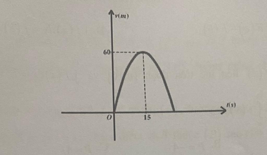 Một xe mô tô phân khối lớn sau khi chờ hết đèn đỏ đã bắt đầu phóng nhanh với vận tốc tăng liên tục được biểu thị bằng đồ thị là đường Parabol như hình vẽ. Biết rằng sau 15s thì xe đạt đến vận tốc cao nhất 60m/s và bắt đầu giảm tốc.Hỏi từ lúc bắt đầu đến lúc đạt vận tốc cao nhất thì xe đã đi được quãng đường bao nhiêu mét?