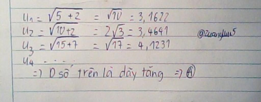 Cho dãy số (Un) biết Un= căn 5n+2. Mệnh đề nào sau đây đúng?