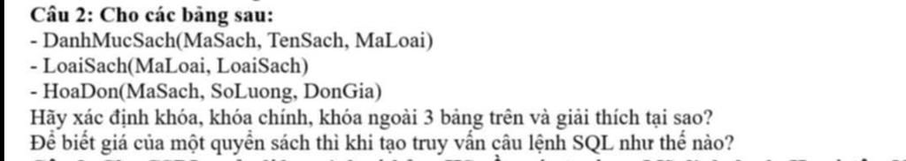 Hãy xác định khóa, khóa chính, khóa ngoài 3 bảng trên và giải thích tại sao?