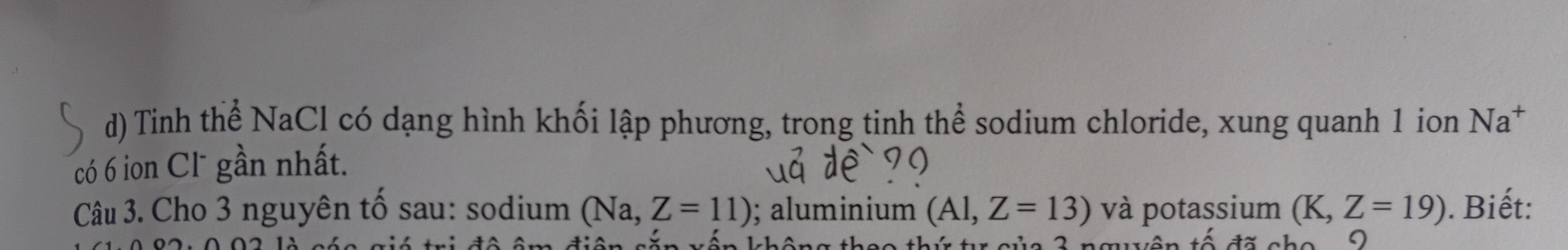 Câu 3. Cho 3 nguyên tố sau: sodium (Na, Z = 11); aluminium (Al, Z= 13) và potassium (K, Z=19). Biết: