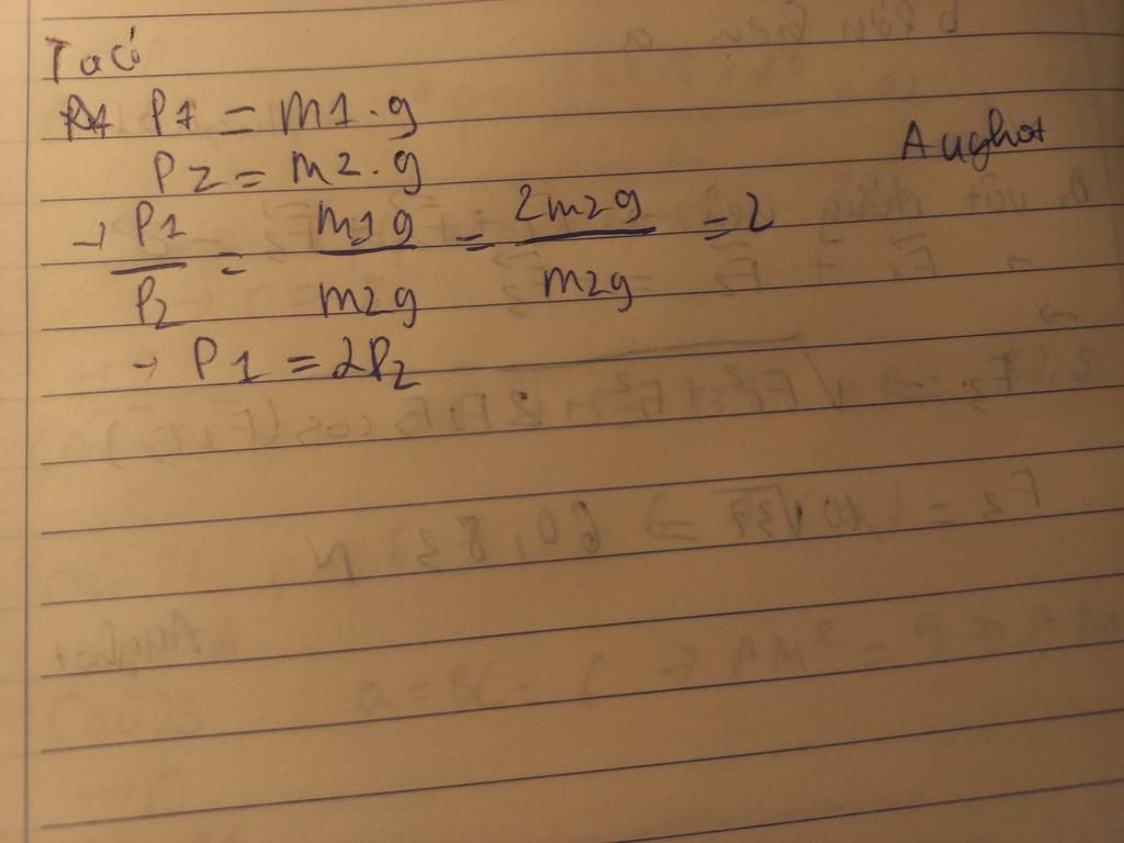 tại cùng một địa điểm hai vật có khối lượng m1=2m2 trọng lực p1 và p2 tác dụng lần lượt lên hai vật sẽ có giá trị