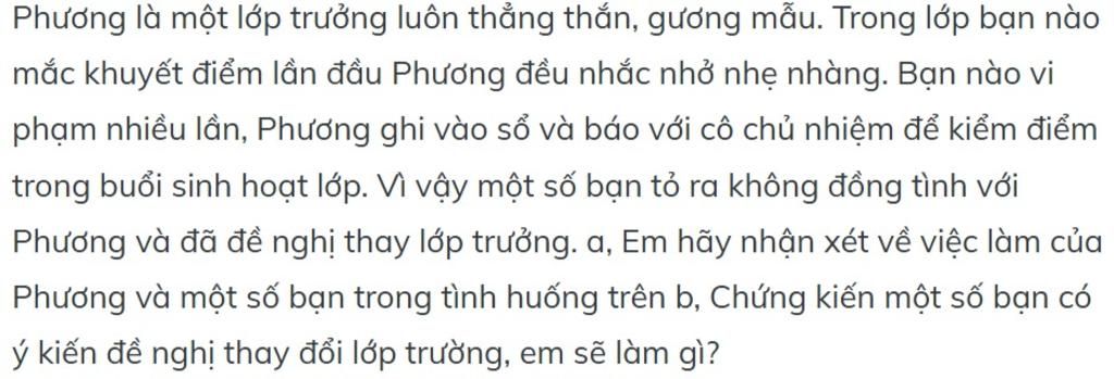 b) Chứng kiến một số bạn có ý kiến đề nghị thay đổi lớp trưởng , em sẽ giải thích cho các bạn vì sao bạn Phương lại làm vậy