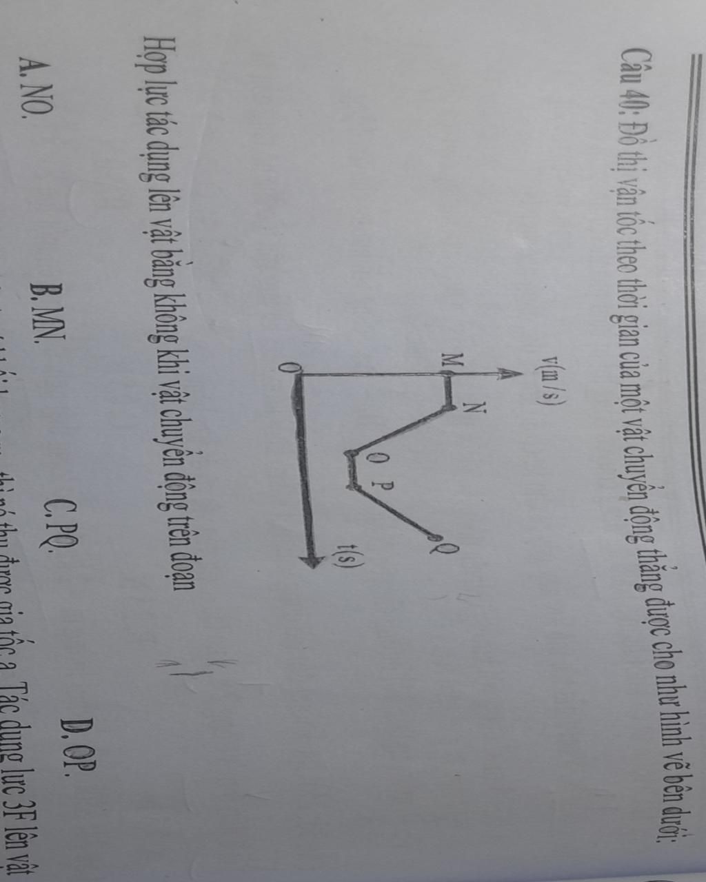 Đây là đồ thị vận tốc- thời gian. khi mà đồ thị kẻ ngang thì vận tốc không đổi mà theo ĐL.1 NEWTON thì vật ko chịu tác dụng của lực nào hoặc hợp lực băng 0 thì vận sẽ dừng lại hoặc tiếp tục chuyển động thẳng đều nên ta chon D