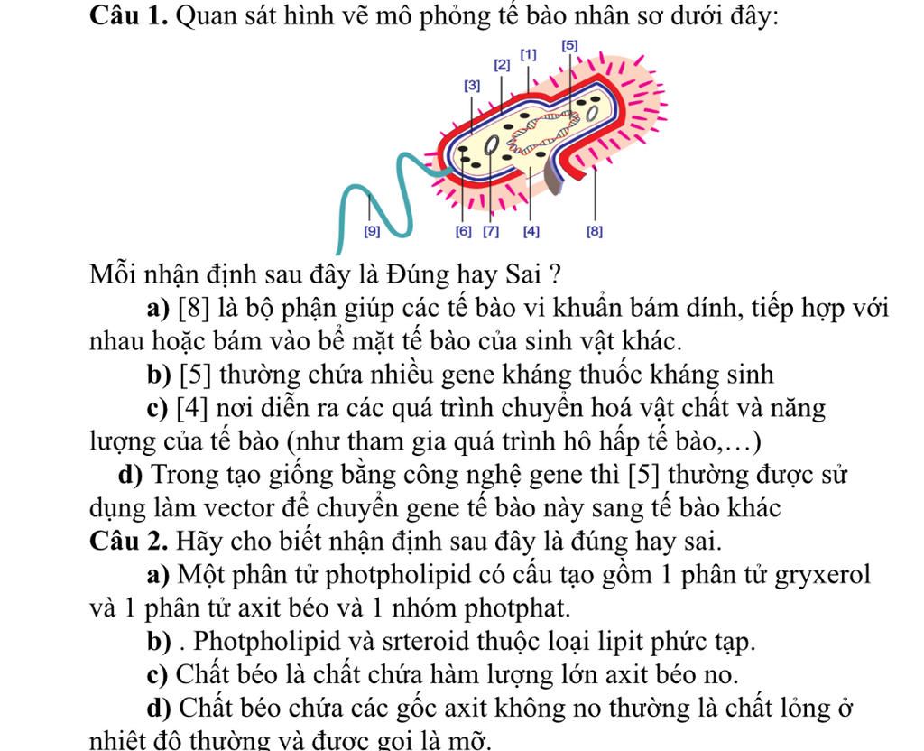 a) [8] là bộ phận giúp các tế bào vi khuẩn bám dính, tiếp hợp với nhau hoặc bám vào bề mặt tế bào của sinh vật khác: Đúng. Pili (hay fimbriae) giúp vi khuẩn bám dính và tiếp hợp với nhau hoặc với bề mặt sinh vật khác.