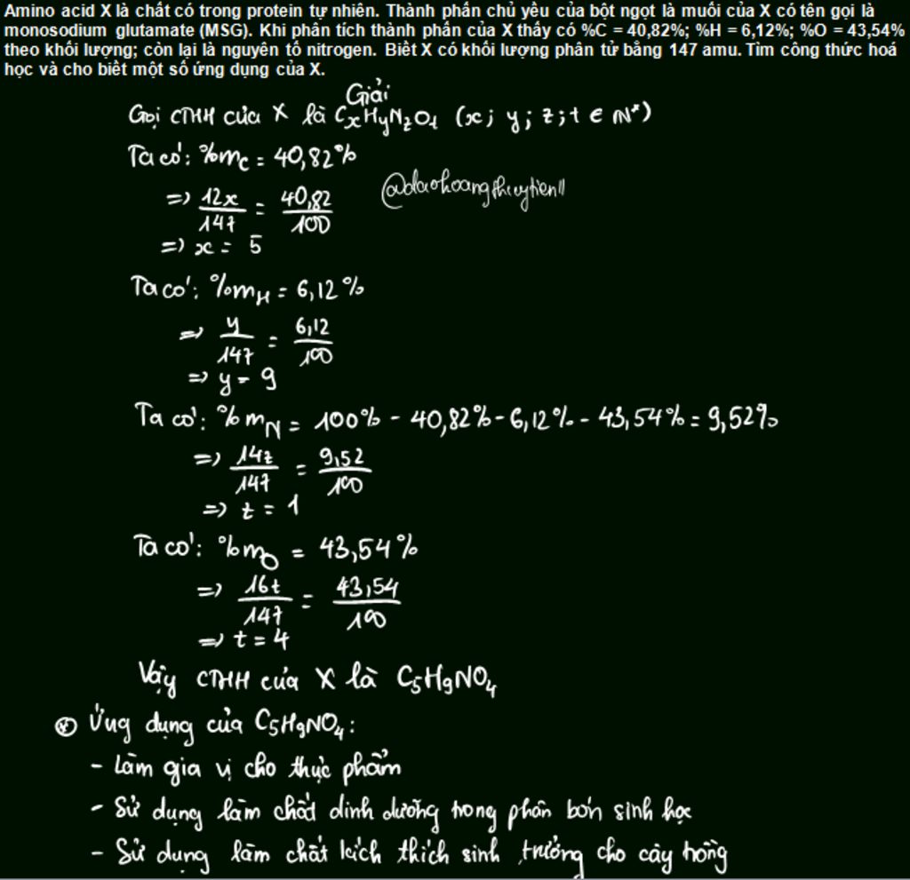 Amino acid X là chất có trong protein tự nhiên. Thành phần chủ yếu của bột ngọt là muối của X có tên gọi là monosodium glutamate (MSG). Khi phân tích thành phần của X thấy có %C = 40,82%; %H = 6,12%; %0 = 43,54% theo khối lượng; còn lại là nguyên tố nitrogen. Biết X có khối lượng phân tử bằng 147 amu. Tìm công thức hoá học và cho biết một số ứng dụng của X.