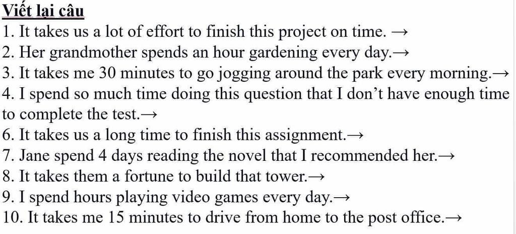 `@` S + spend + time + V_ing = It + take + time + to V_inf : tốn bao lâu để làm gì