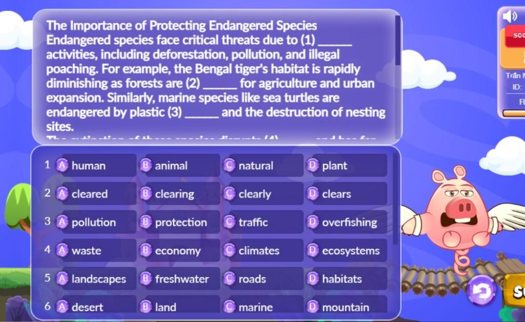 `-` deforestation (n): phá rừng `;` pollution (n): sự ô nhiễm `;` poaching (n): săn bắn, lâm tặc