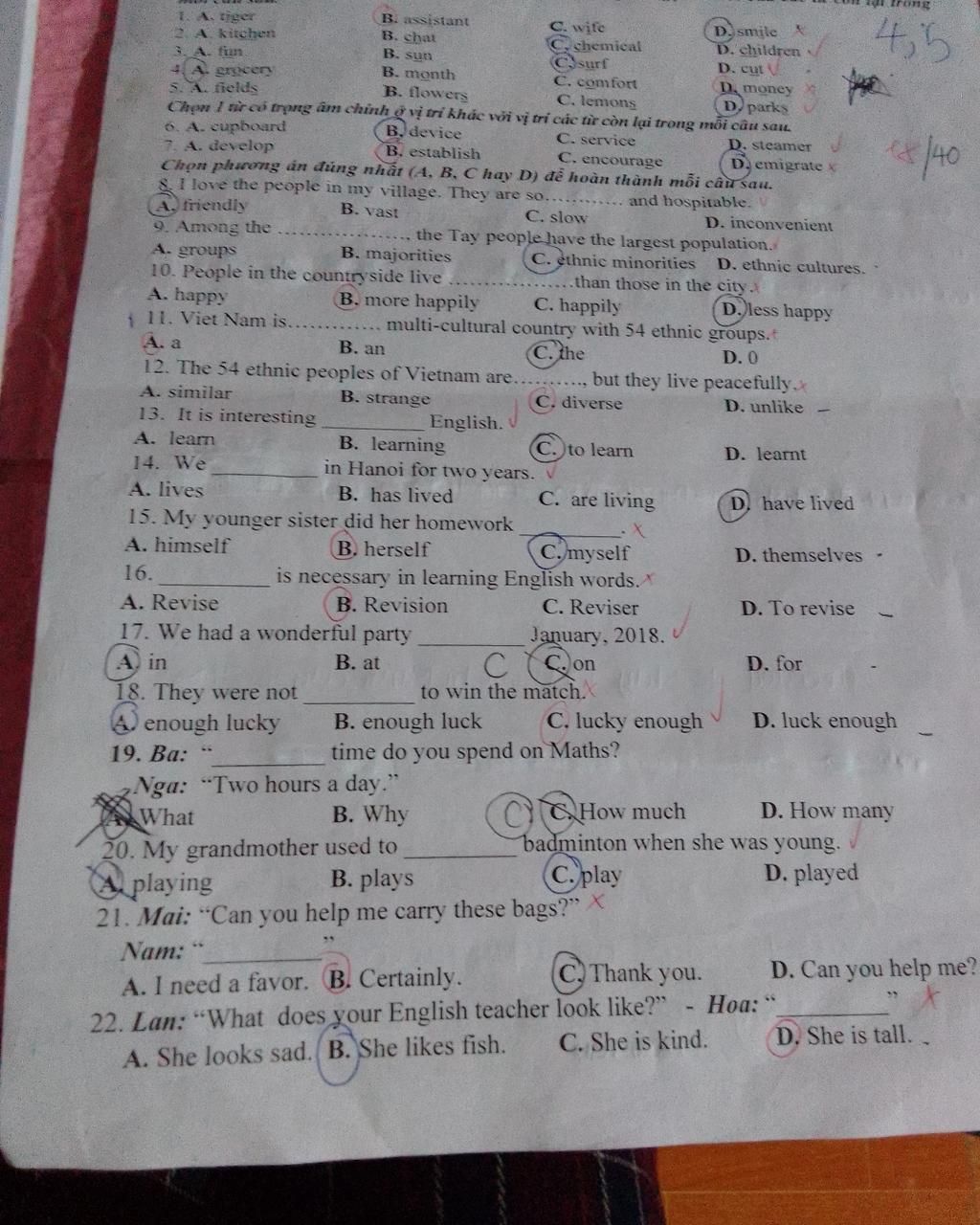 Chọn 1 từ có trọng âm chính ở vị trí khác với vị trí các từ còn lại trong mỗi câu s ...