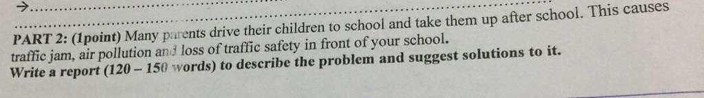 Many parents drive their children to school and take them up after school. This causes traffic jam, air pollution and loss ò traffic safety in fronf of your school