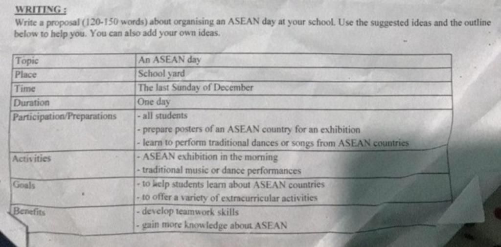 Mở đoạn: To celebrate the rich cultural diversity of ASEAN countries, we propose organizing an ASEAN Day at our school on the last Sunday of December.