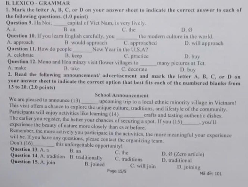 q13:D (upcoming là adj , a/an/the đi với Noun)