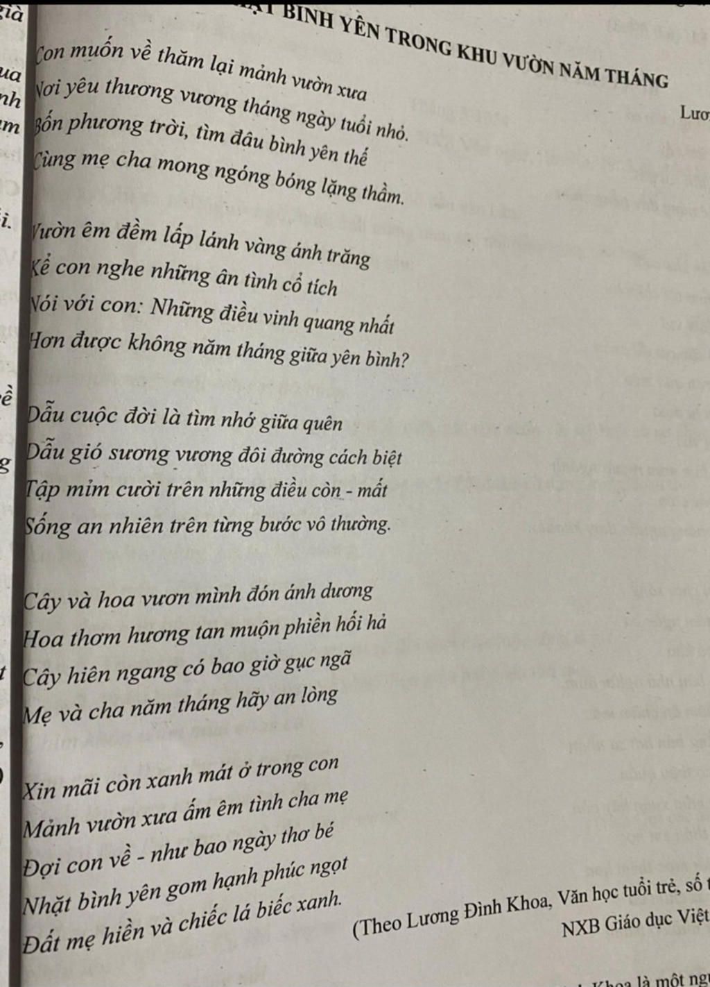 Bài thơ Nhặt bình yên trong khu vườn năm tháng của tác giả Lương Đình Khoa là một tác phẩm đầy cảm xúc, thể hiện nỗi nhớ quê hương, tình yêu thương với gia đình, đặc biệt là với cha mẹ và mảnh vườn tuổi thơ. Qua những vần thơ giản dị, tác giả không chỉ khơi gợi về những ký ức đẹp đẽ mà còn truyền tải thông điệp về sự bình yên, hạnh phúc trong cuộc sống.