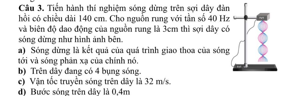 `b)` Quan sát hình ta thấy sợi dây có `5` nút sóng và `4` bụng sóng