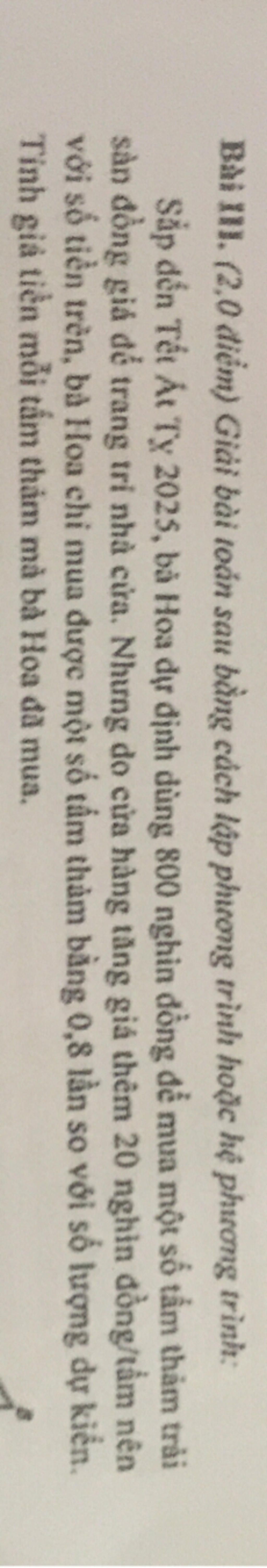 Lúc đầu bà Hoa mua được số tấm thảm là `800/x` (tấm)