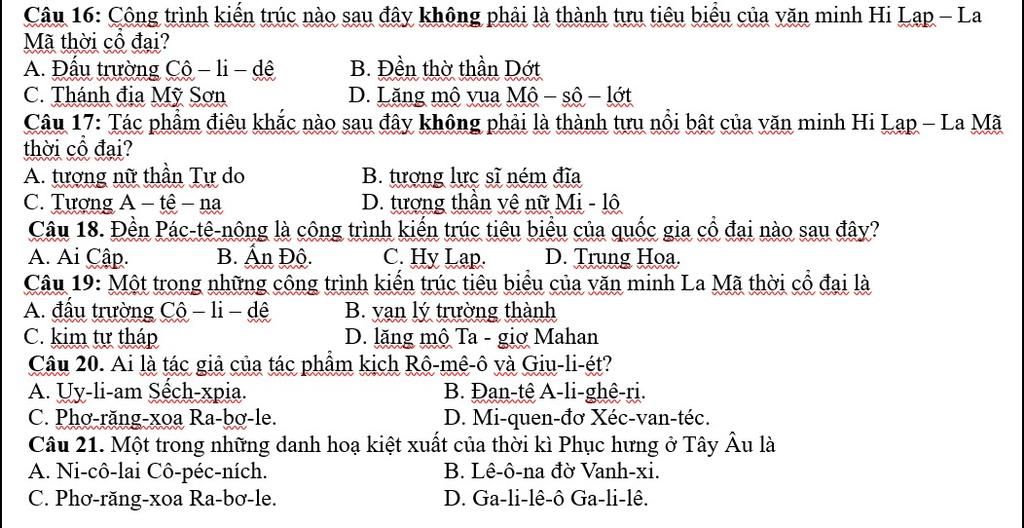 Câu 16: Công trình kiến trúc nào sau đây không phải là thành tựu tiêu biểu của văn minh Hi Lạp – La Mã thời cổ đại?