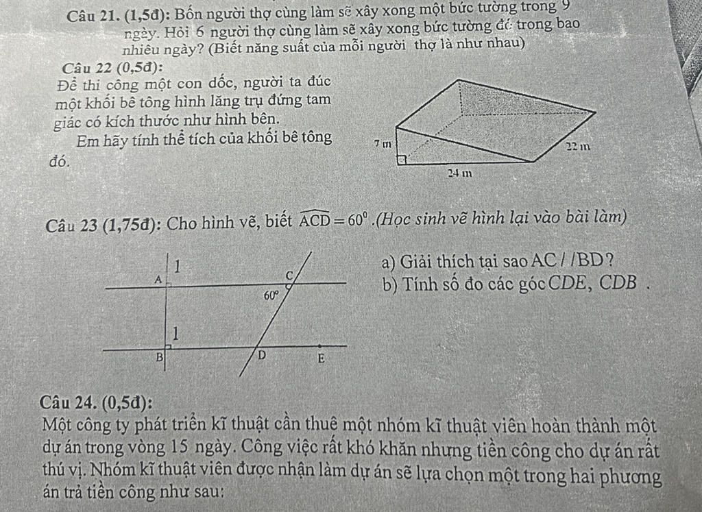 Câu 21. (1,5đ): Bốn người thợ cùng làm sẽ xây xong một bức tường trong 9