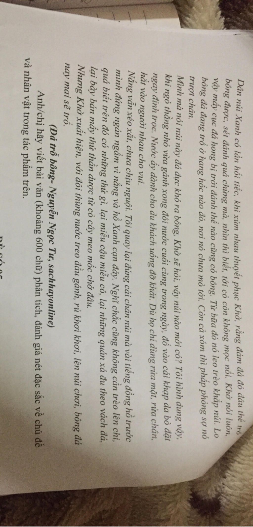 NV Khờ là hình mẫu tiêu biểu cho sự ngây thơ trog sáng. NV khờ không chỉ là 1 cậu bé bình thường mà còn là biểu tượng cho nhiều những ước mơ ,khát vọng vươn tới cái đẹp.Dù bị mọi người xung quanh hoài nghi về khả năng tìm ra bông đá khờ vẫn kiên trì và tin tưởng vào những gi mình đang làm.Sự quyết tâm của NV Khờ thể hiện rõ qua hành động leo trèo khắp núi tìm kiếm những điều mới mẻ.Điều này ko chỉ cho thấy sự dũng cảm mà còn là 1 thôn điệp mạnh mẽ về vc theo đuổi ước mơ bất chấp những khó khăn và sự hoài nghi từ ngk.Ngoài ra TP còn khắc hoạ bối cảnh thiên nhiên hùng vĩ của núi xanh nơi mà những viên đá tưởng trừng như vô tri có thể mag trog mình những điều kỳ diệu.H/ả những viên đá là vật thể ko chỉ là vât thể mà còn là biểu tượng cho những thử thách trog cuộc sống.Khờ với sự ngây thơ và lòng tin mãnh liệt đã biến những viên đá khô thành cơ hội để khám phá và sáng tạo.