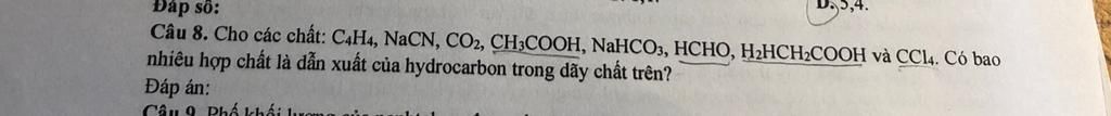 `\to` Các dẫn xuất của hydrocarbon là: `CH_3COOH`, `HCHO`, ` H_2NCH_2COOH`, `C Cl_4`