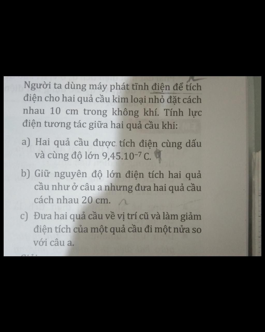\({F_1} = \dfrac{{k.{q^2}}}{{{r^2}}} = \dfrac{{{{9.10}^9}.{{\left( {9,{{45.10}^{ - 7}}} \right)}^2}}}{{0,{1^2}}} = 0,804N\)