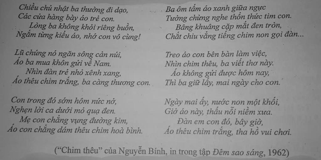 Giải thích: Trong bài thơ có 6 khổ thơ với mỗi khổ thơ đều có 2 câu thơ đầu là 2 câu thơ bảy chữ và hai câu thơ cuối thuộc thể loại lục bát (6 chữ - 8 chữ)