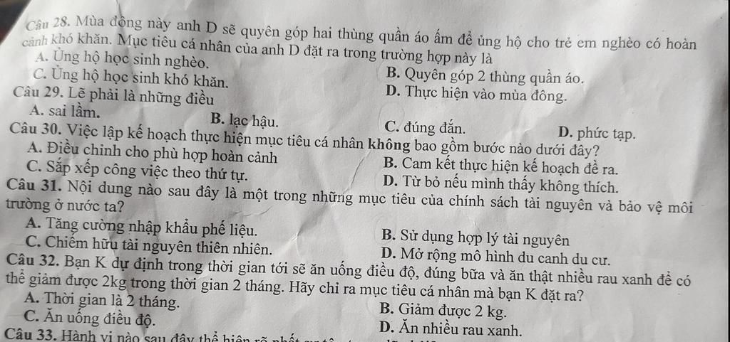 Câu 28. Mục tiêu cá nhân của anh D là quyên góp 2 thùng quần áo ấm. Việc ủng hộ trẻ em nghèo là động cơ, còn việc quyên góp 2 thùng quần áo là mục tiêu cụ thể anh ấy đặt ra để đạt được mục đích đó.