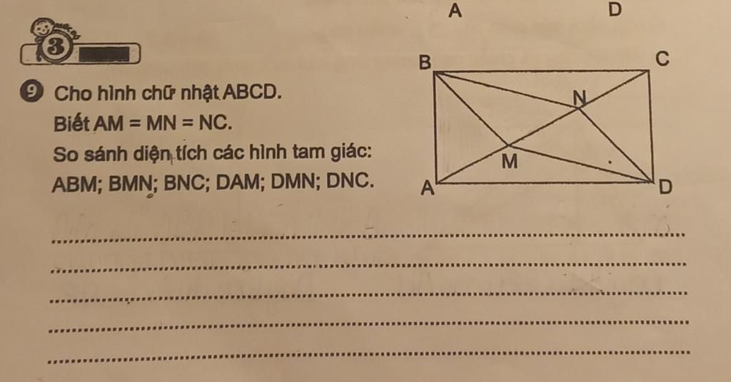- Diện tích của các tam giác ABM, BMN, BNC bằng diện tích của các tam giác DAM, DMN, DNC vì cùng chung tổng diện tích hình chữ nhật và đường chéo chia hình chữ nhật thành 2 phần bằng nhau.