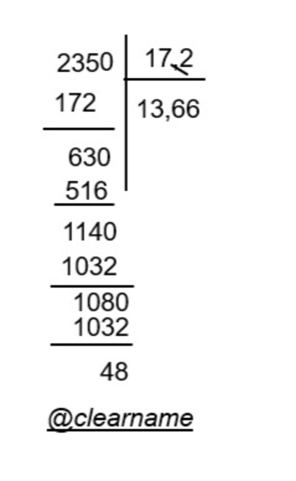 `->` Nếu thương chỉ lấy đến `2` chữ số ở phần thập phân thì số dư của phép chia `235` `:` `17,2` là `0,048`