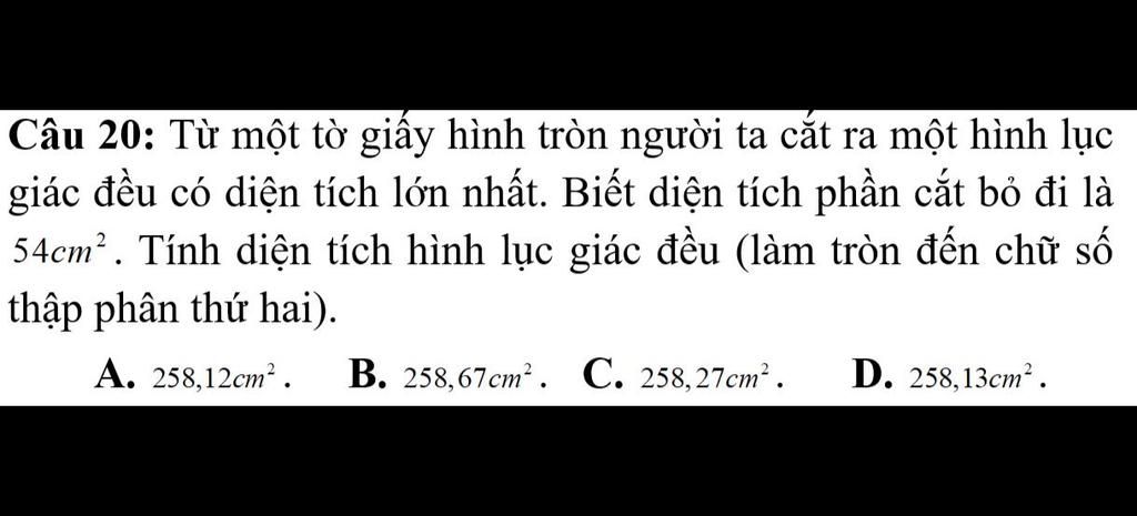 `=> S_(tròn) - S_(lục giác) = 54`