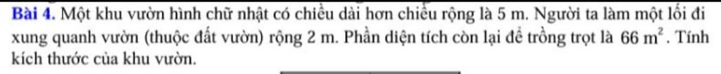 Chiều dài của phần khu vườn còn lại sau khi làm lối đi là: `x - 4 (m)`