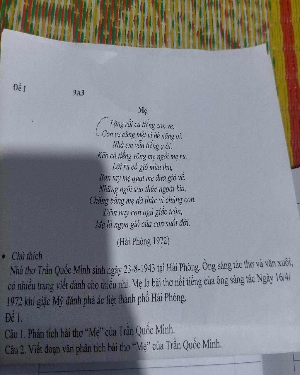 Nhà thơ Trần Quốc Minh quê tại Hải Phòng, ông sáng tác cả thơ và văn xuôi và có nhiều sáng tác dành cho thiếu nhi. Bài thơ "Mẹ" được ông viêt vào ngày 16 tháng 4 năm 1972, khi giặc Mĩ đánh phá ác liệt thành phố Hải Phòng. Với những hình ảnh thơ thân thuộc gần gũi, tác phẩm là tình mẫu tử thiêng liêng, là lòng biết ơn của con đối với mẹ.