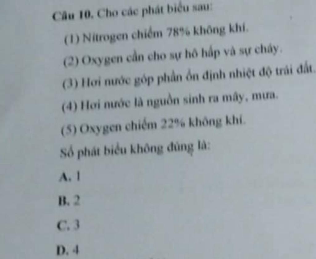 Oxy chiếm 22% không khí. ⇒ Sai (Oxy chỉ chiếm 21% không khí)