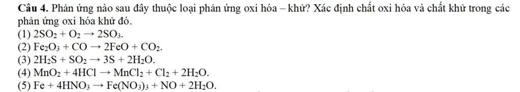 (4) Chất oxi hóa: MnO2; Chất khử: HCl