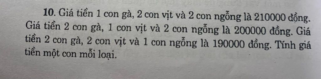 Giá tiền của một con vịt là 10000 đồng; giá tiền của một con ngỗng là 20000 đồng; giá tiền của một con gà là 75000 đồng.