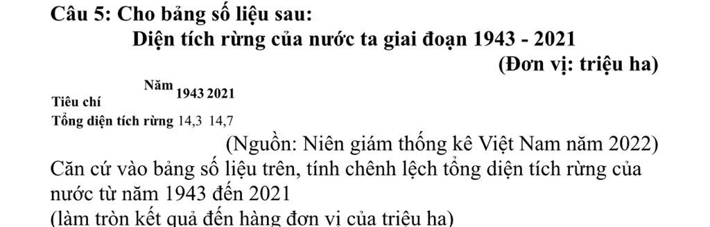 Căn cứ vào bảng số liệu trên, tính chênh lệch tổng diện tích rừng của