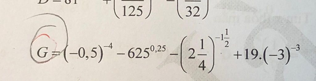 `G=1/[(-0.5)^4] - (5^4)^[1/4]-[(3/2)^2]^[-3/2]+19*1/[(-3)^3]`