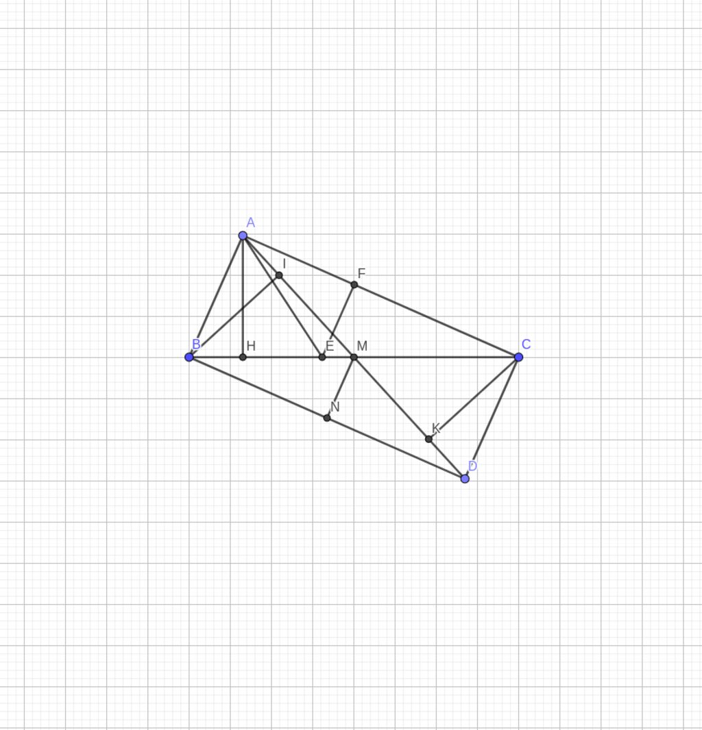 Cho tam giác ABC vuông tại A (AB < AC). Gọi M là trung điểm của cạnh BC, lấy điểm D thuộc tia đối của tia MA sao cho MD = MA. Kẻ BI vuông góc với AD tại I, CK vuông góc với AD tại K.