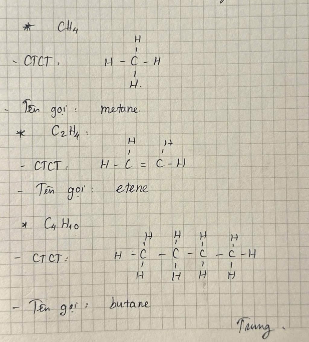 Câu 2: Viết Công Thức Cấu Tạo và Gọi tên của các chất có công thức sau: CH4, C2H4, C4H10