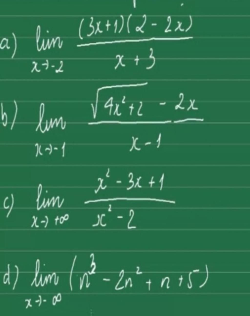 $a)\lim\limits_{x\to -2}\dfrac{(3x+1)(2-2x)}{x+3}\\=\dfrac{[3.(-2)+1][2-2.(-2)]}{-2+3}\\=-30.\\b)\lim\limits_{x\to -1}\dfrac{\sqrt{4x^2+2}-2x}{x-1}\\=\dfrac{\sqrt{4.(-1)^2+2}-2.(-1)}{-1-1}\\=-\dfrac{2+\sqrt{6}}{2}.\\c)\lim\limits_{x\to +\infty}\dfrac{x^2-3x+1}{x^2-2}\\=\lim\limits_{x\to+\infty}\dfrac{1-\dfrac{3}{x}+\dfrac{1}{x^2}}{1-\dfrac{2}{x^2}}\\=\dfrac{1-0+0}{1-0}=1.\\d)\lim\limits_{x\to-\infty}(n^3-2n^2+n+5)\\=\lim\limits_{n\to-\infty}\left[n^3\left(1-\dfrac{2}{n}+\dfrac{1}{n^2}+\dfrac{5}{n^3}\right)\right]\\=\lim\limits_{n\to-\infty}n^3.\lim\limits_{n\to-\infty}\left(1-\dfrac{2}{n}+\dfrac{1}{n^3}+\dfrac{5}{n^3}\right)\\=-\infty.1\\=-\infty.$