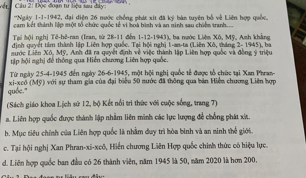 `=>` Liên hợp quốc không được thành lập nhằm liên minh các lực lượng để chống phát xít. Liên hợp quốc được thành lập với mục tiêu chính là duy trì hòa bình và an ninh thế giới, sau chiến tranh.