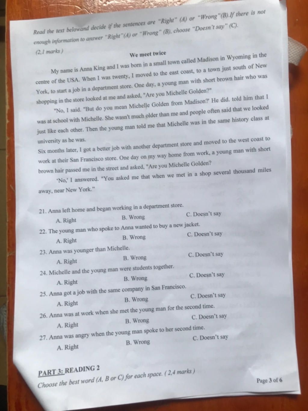 25. B (Six months later, I got a better job with another department store and moved to the west coast to work at their San Francisco store.)