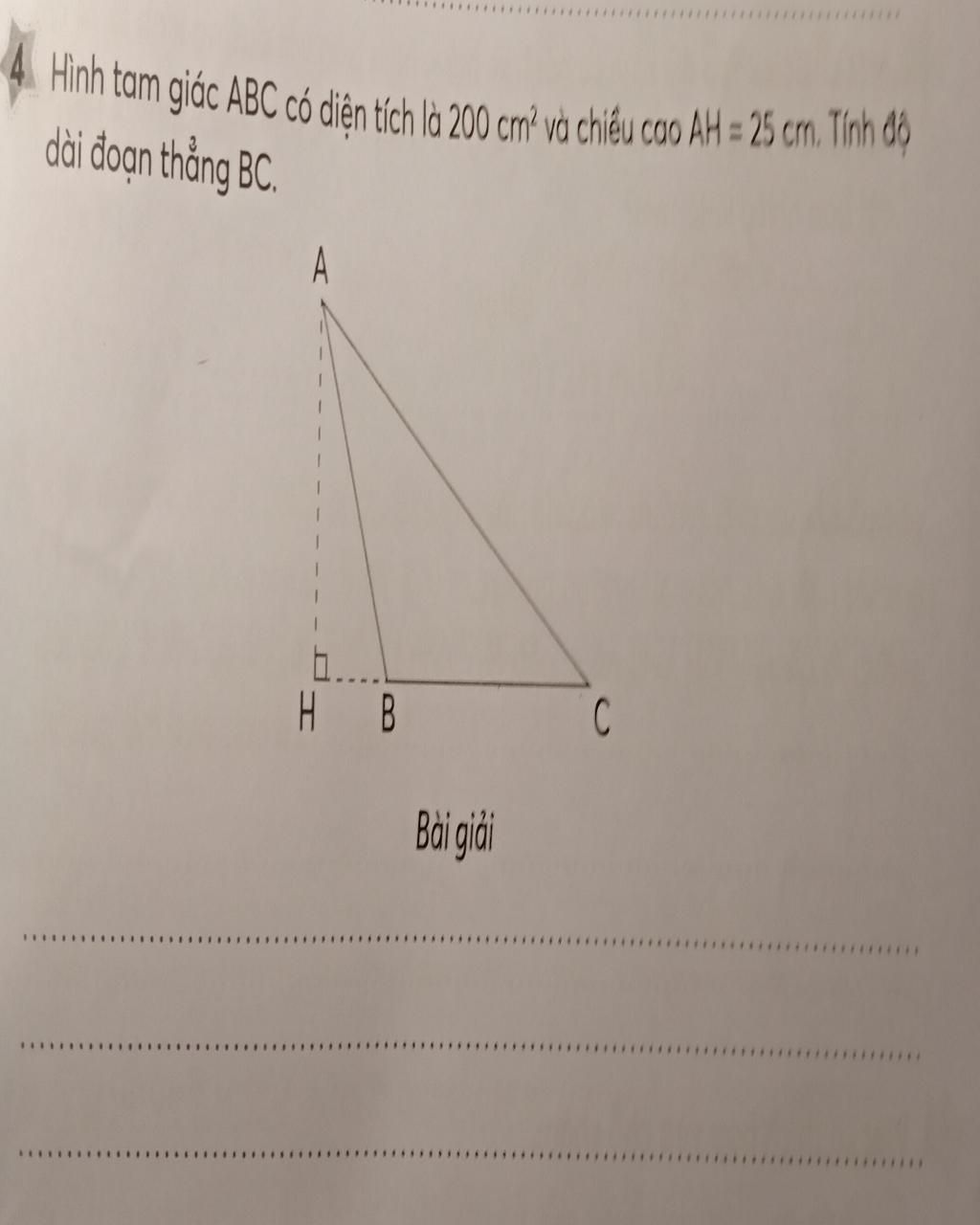 Hình tam giác ABC có diện tích là 200 cm vuông và chiều cao AH = 25 cm tính độ dài đoạn thẳng bc