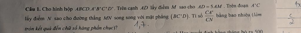 $\to \dfrac{CA'}{CN}=\dfrac{\sqrt{1^2+1^2+1^2}}{\sqrt{(1-\dfrac25)^2+(1-\dfrac25)^2+(1-\dfrac25)^2}}=\dfrac53\approx 1.7$