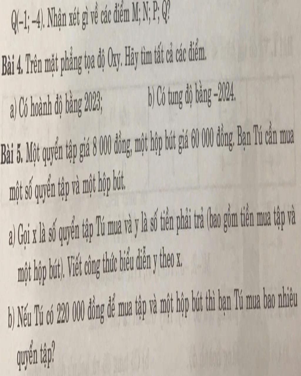 `a)` Gọi `x` là số quyển tập Tú mua , `y` là số tiền phải trả (gồm tiền mua tập và 1 hộp bút).