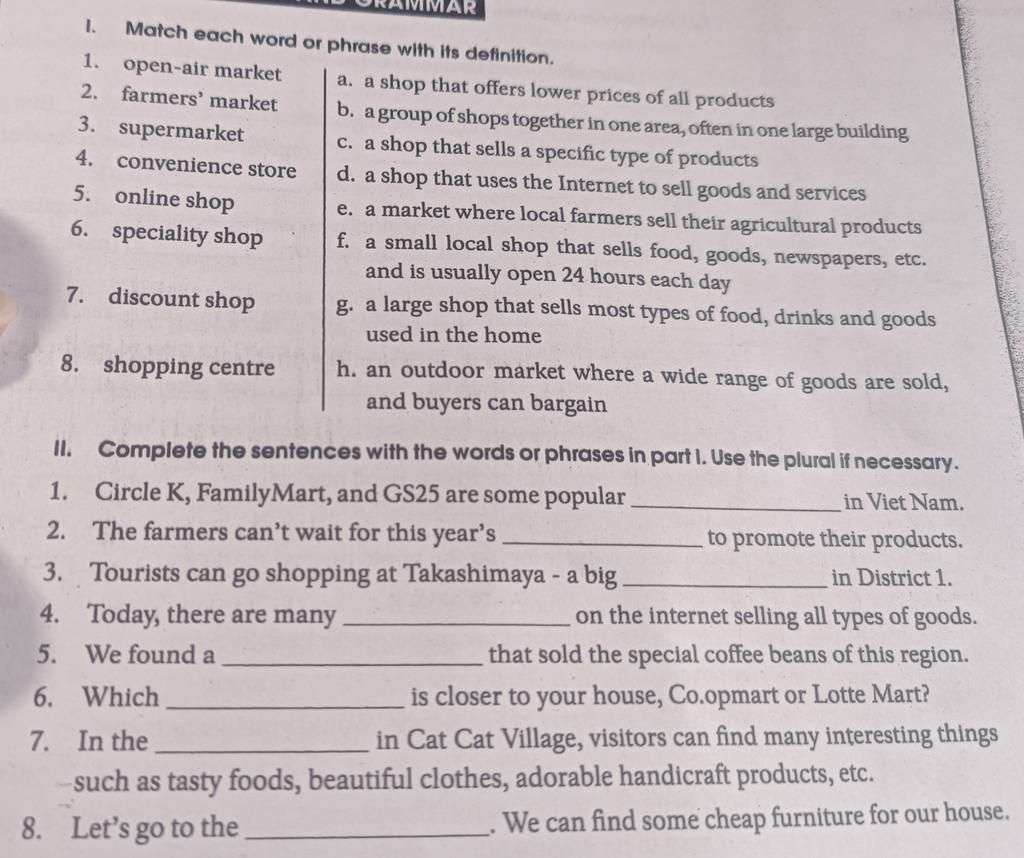 $4.$ convenience store - f. a small local shop that sells food, goods, newspapers, etc., and is usually open 24 hours each day